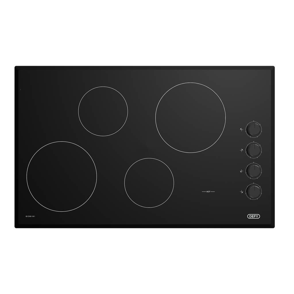 Defy black ceramic hob with 4 zones. Residual heat indicators, easy-clean surface, and energy efficient operation.