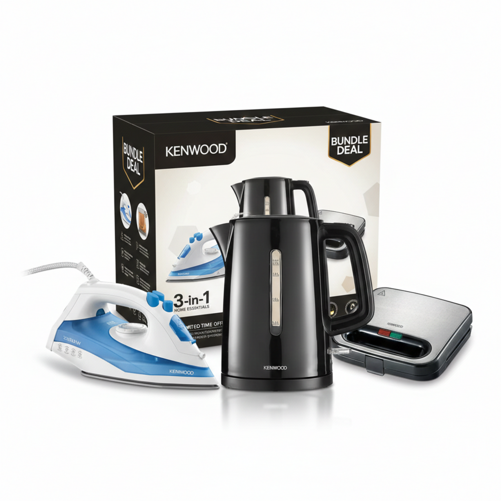 Upgrade your kitchen with the Kenwood Bundle 1: Steam Iron, Kettle, and Sandwich Press. Reliable performance for everyday meals and care.